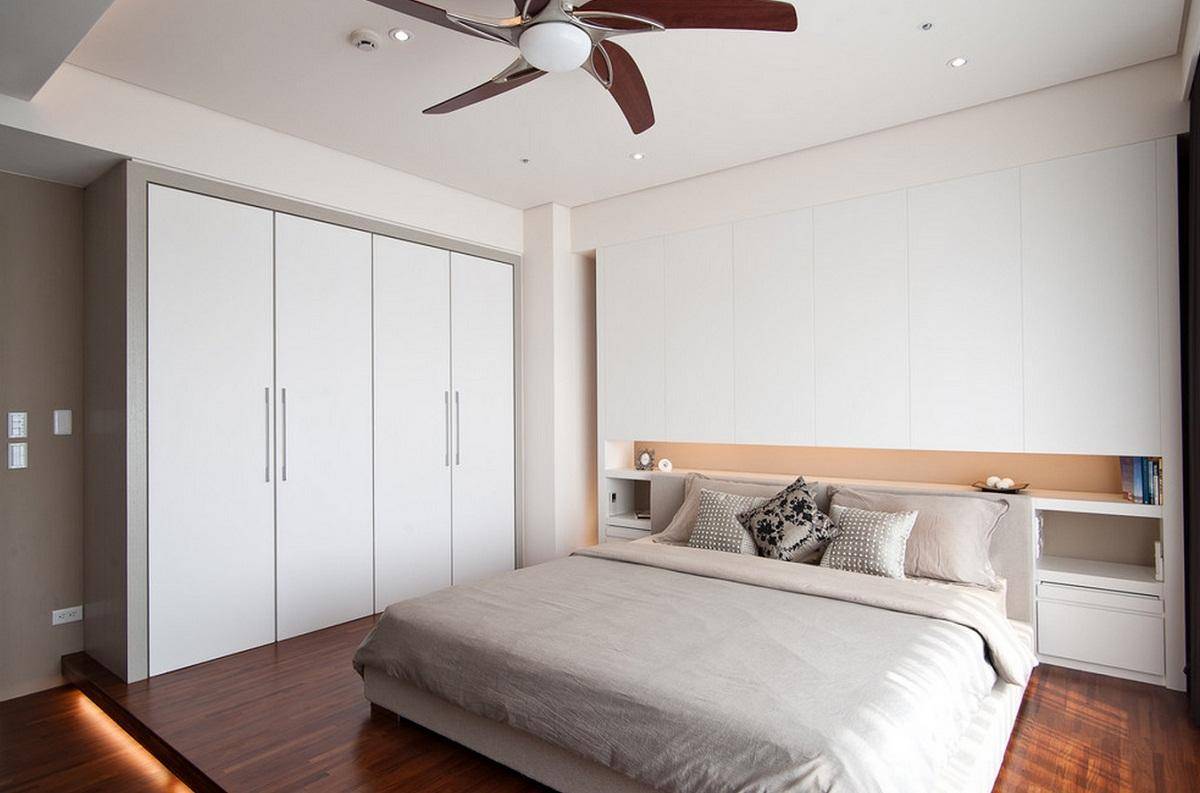 Если в планировке есть выступы, ниши, их можно рационально использовать для организации встроенной гардеробной в спальне. Например, дверь-купе скроет недостатки комнаты, станет изюминкой интерьера.