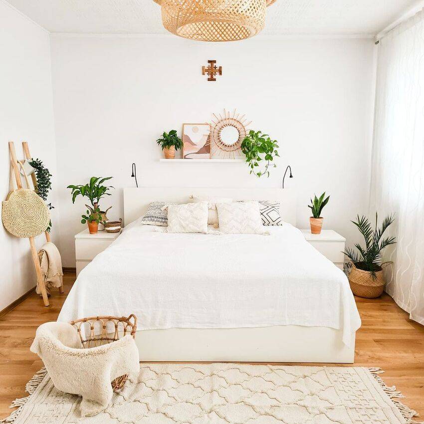 Спальня в белом цвете никогда не будет мрачной и унылой. Изюминкой комнаты станут фактурные материалы: 3D-панели или венецианская штукатурка у изголовья, ковер с большим ворсом на полу, оригинальный текстиль и обои.