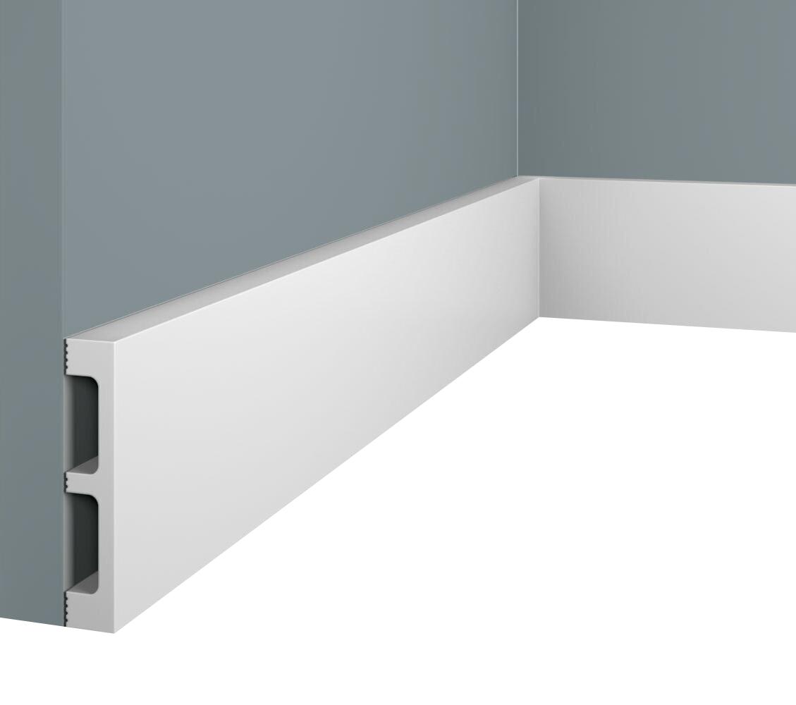 Бельгийская компания предлагает серию с минималистическим дизайном. Высота 100 мм позволяет использовать в комнатах с потолками 2,7-3 м. Лёгкие завитки в верхней части придают интерьеру дополнительную элегантность. При небольшой толщине в 16 мм производитель предусмотрел два параллельных паза для прокладки телефонного кабеля или слаботочных сетей.