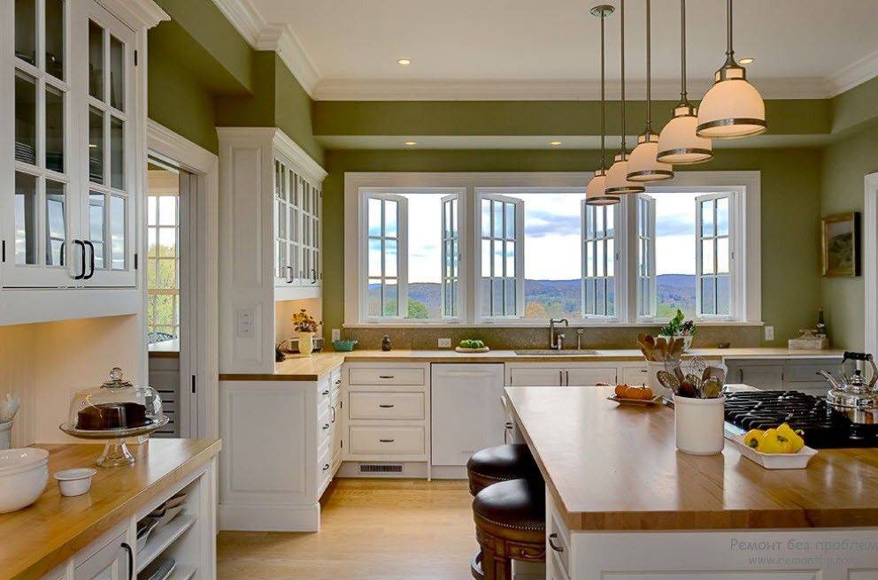 Само окно на кухне может располагаться по-разному: быть одним большим светлым пятном или узким и высоким, иметь несколько створок или располагаться в углу комнаты. При наличии нескольких окон в кухне в один из угловых проемов монтируют шкаф для посуды.