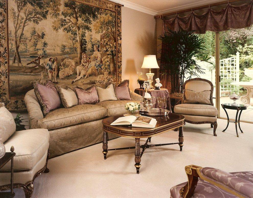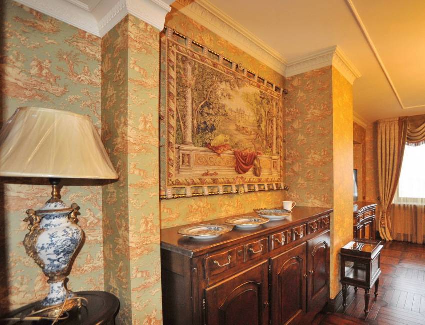 Сюжетные гобелены, напоминающие те, что наши предки ткали вручную, будут отлично смотреться в классической гостиной. Золотистые нити в текстильных коврах прекрасно сочетаются с блеском роскошных люстр и бра, перекликаясь с позолоченными элементами декора рам для зеркал и картин.
