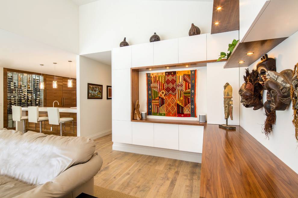 Декор органично впишется в общий дизайн комнаты. Для гостиной также подойдет панно или текстильный ковер, который украшает оригинальный орнамент. Зрительно сбалансировать восприятие помещения позволит драпировка, выполненная в аналогичном стиле;