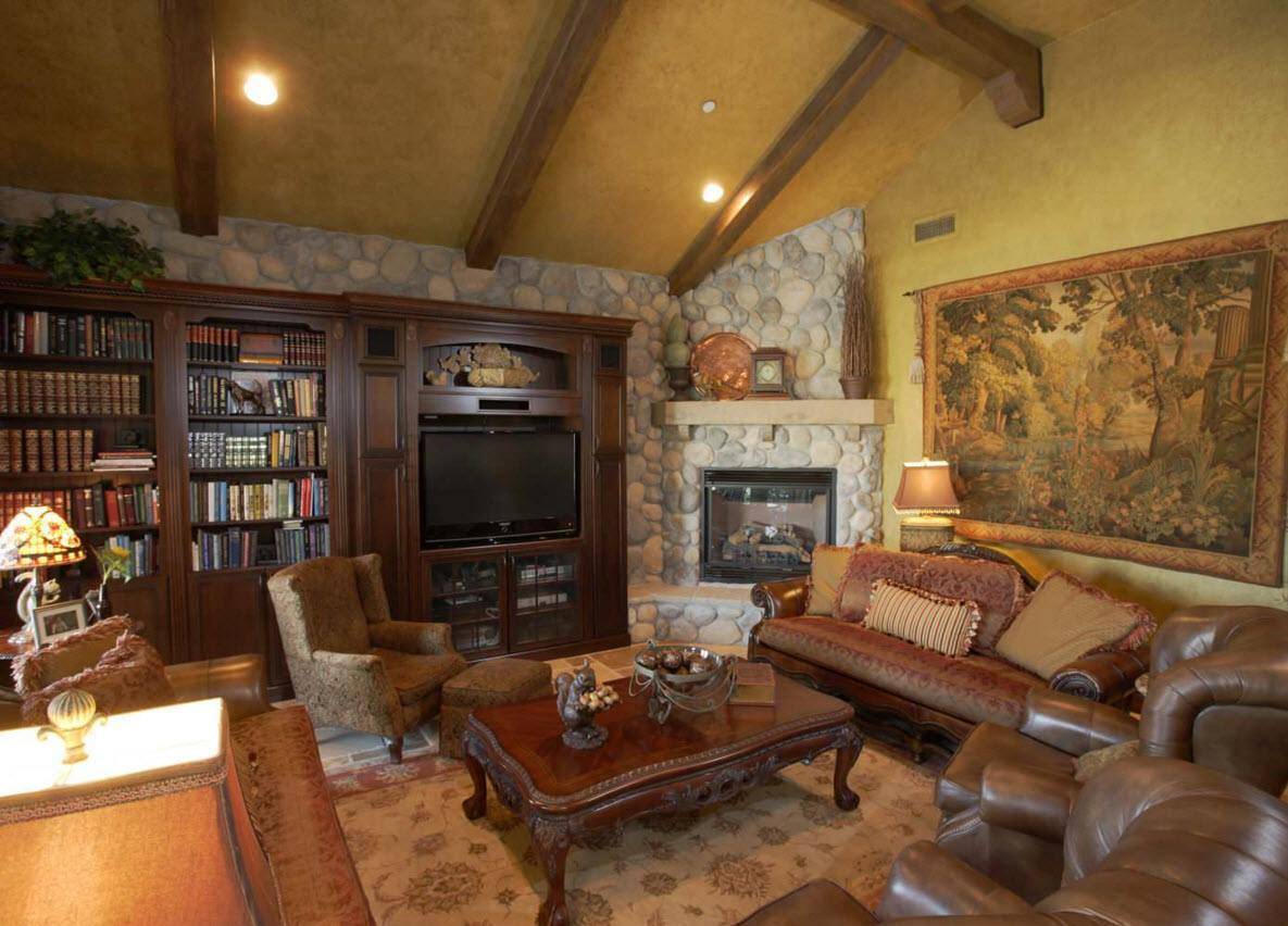 Для любителей же более тяжеловесных декораций можно предложить сочетание гобеленовых картин с изображением охотничьих сцен и массивной деревянной мебели, кованых каминов и тяжелых портьер. Такой дизайн сделает гостиную похожей на охотничий домик либо на роскошный зал какого-нибудь средневекового замка. В выборе дизайна оформления все зависит от вкуса хозяина и общей направленности в исполнении всего жилого помещения.