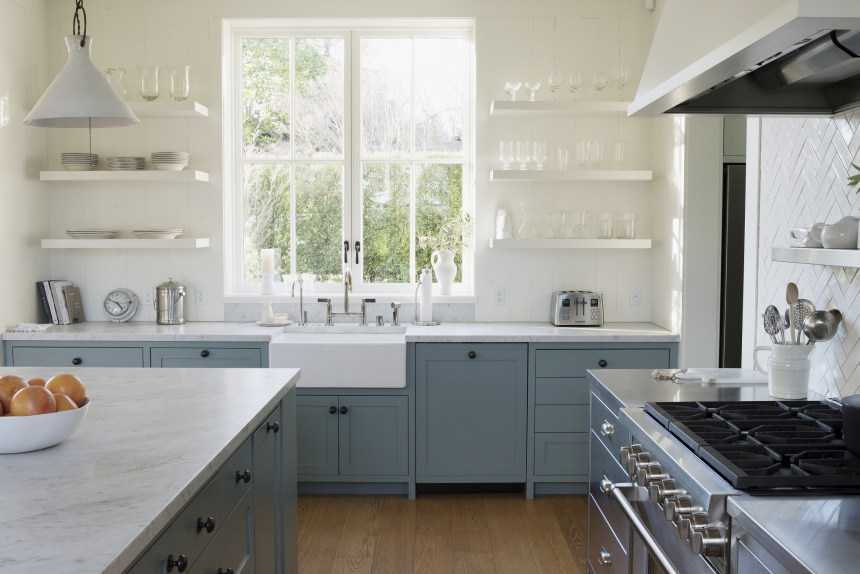 - Самый простой вариант — выбрать однотонные классические фасады. Симпатично выглядят модели голубого цвета с каменной столешницей или контрастной деревянной.