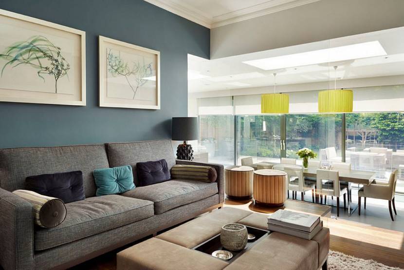 - «Западные» гостиные отделываются холодными цветами (оттенки синего, мятного, нейтрального серого).