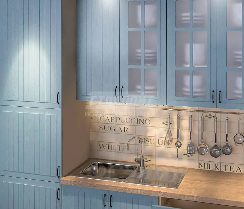 С помощью стен и потолка создаётся основа для голубого фона. Обычно они окрашиваются в белый цвет, но возможны варианты. Главная задача – подобрать подходящую палитру и качественные отделочные материалы. Для облицовки стен на кухне, используются следующие строительные позиции: