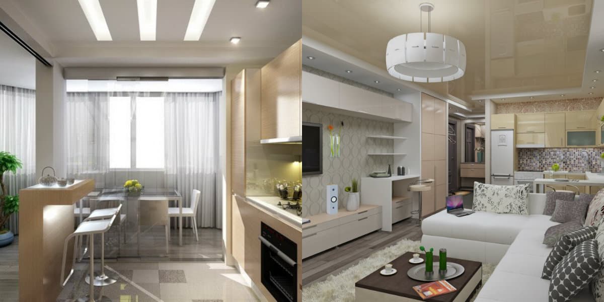 Потолка. Потолки в гостиной можно украсить декоративными деревянными балками, в то время как в кухне оставить однотонное покрытие. Подобное сочетание прекрасно смотрится в интерьере в стиле кантри или модерн.