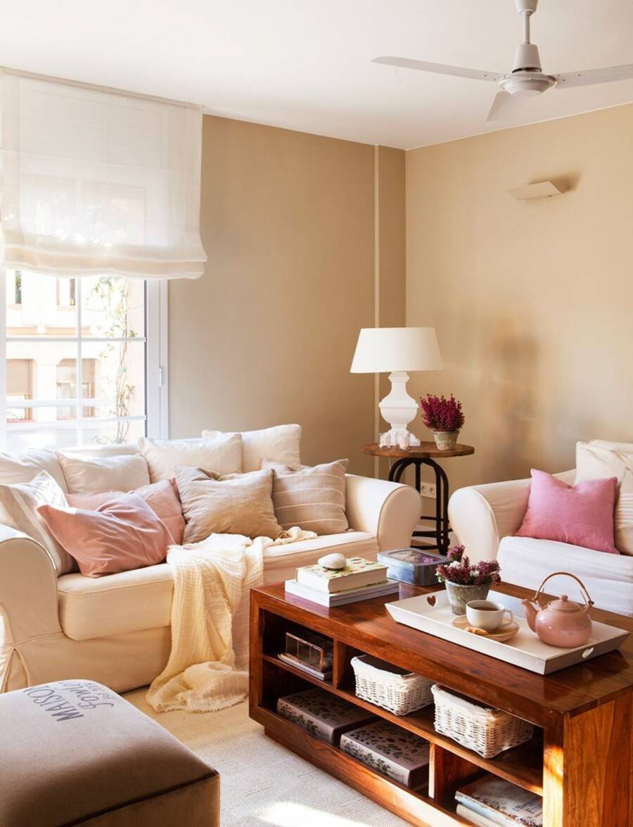 Розовый цвет придает бежевому интерьеру нотки нежности, изысканности и теплоты