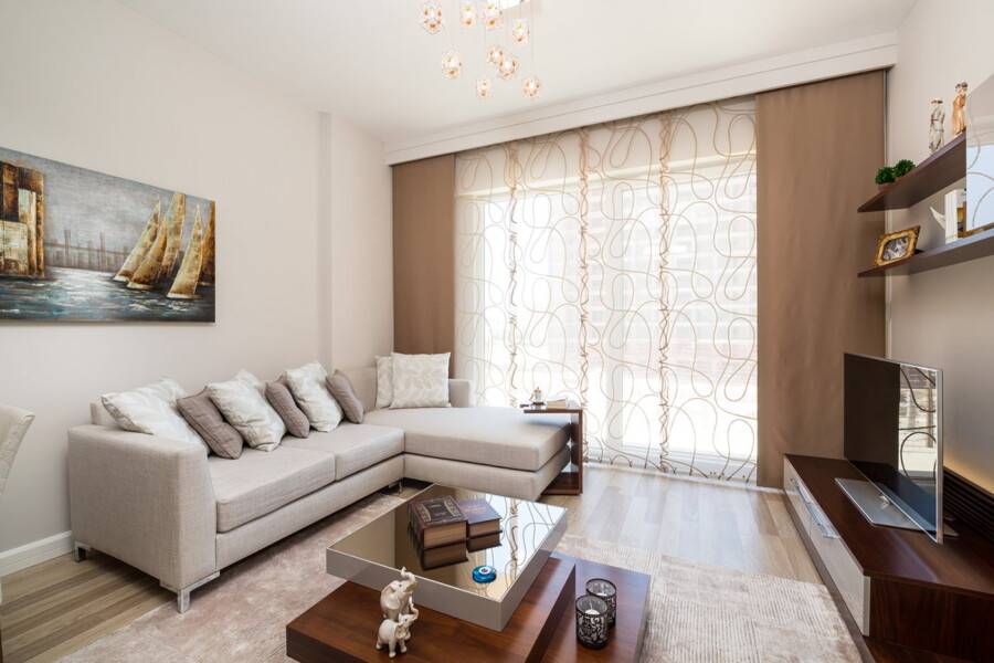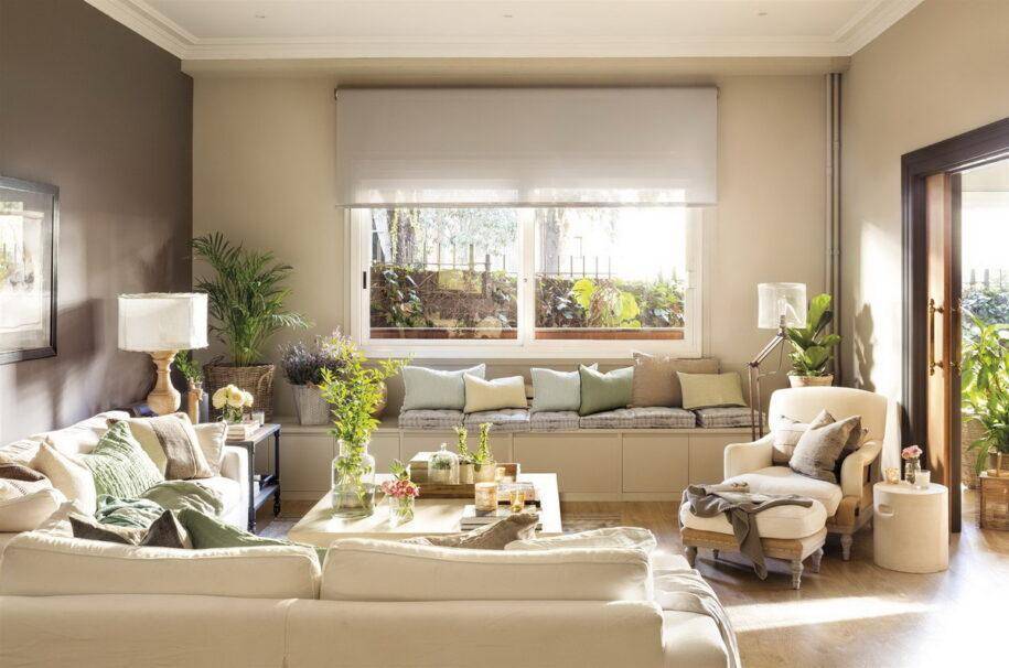 Что касательно декоративных элементов, то наиболее выгодным решением станет покупать все декоративные элементы в одном-двух цветах. Это избавит вас от безвкусно обустроенного пространство и от лишних переживаний по поводу украшения пространства. Например, если вы выбираете шторы в бежевых тонах, то они будут прекрасно сочетаться с молочными вазами и подушками, на фоне более темной мебели.