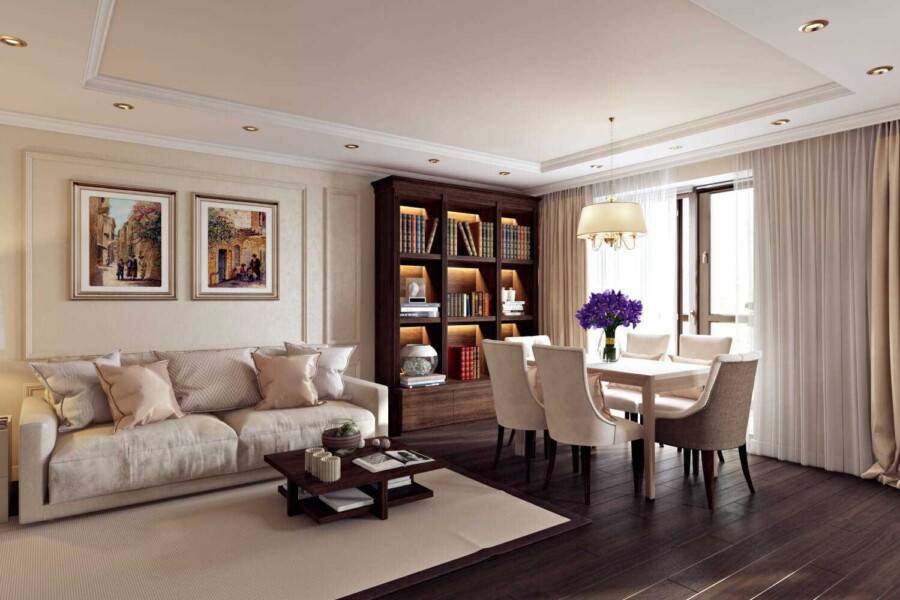 - Классический – необходимы контрастные комбинации светлых и насыщенных тонов (напольное покрытие оттенка горького шоколада и нежно-бежевые поверхности стен, светлая мебельная обивка и подлокотники из темной древесины).