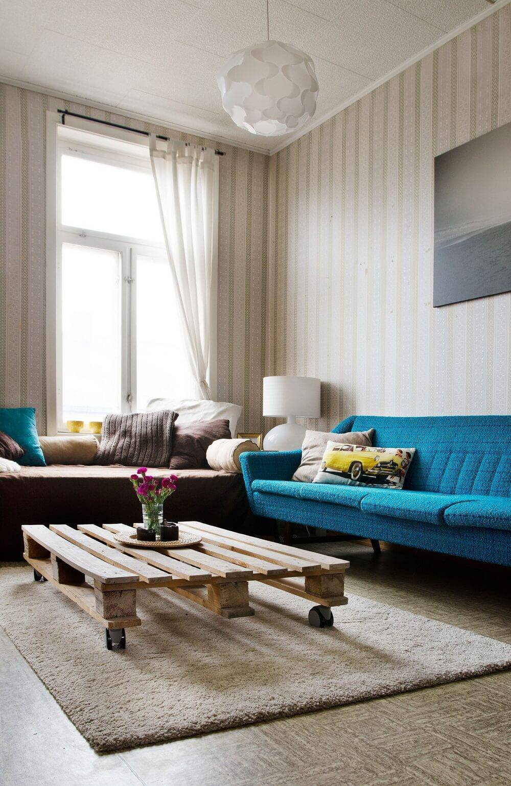 Одно из классических сочетаний цветов, подходящее для любой комнаты – от гостиной до детской комнаты. Обои бежевого цвета в интерьере послужат фоном для голубых акцентов. Это универсальное сочетание зрительно расширит пространство, особенно если это маленькое помещение, и освежит его. Однако стоит иметь ввиду, что подобное решение будет постоянно провоцировать чувство холода у хозяев, что не очень хорошо для спален. К тому же любое пятно будет заметно.