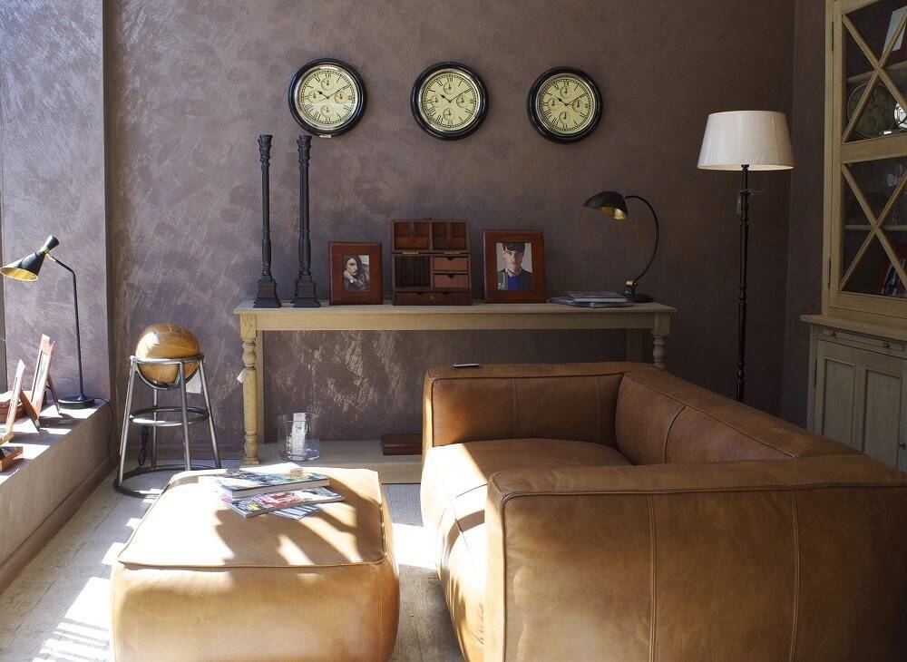 Великолепно украсит обстановку диван с графитовой кожаной обивкой. Предметы в виде столов, кресел и прочего могут также обладать черной, белой, коричневой или кофейной расцветкой. В качестве ярких акцентов подойдут предметы в красных, зеленых, желтых или рыжих тонах.
