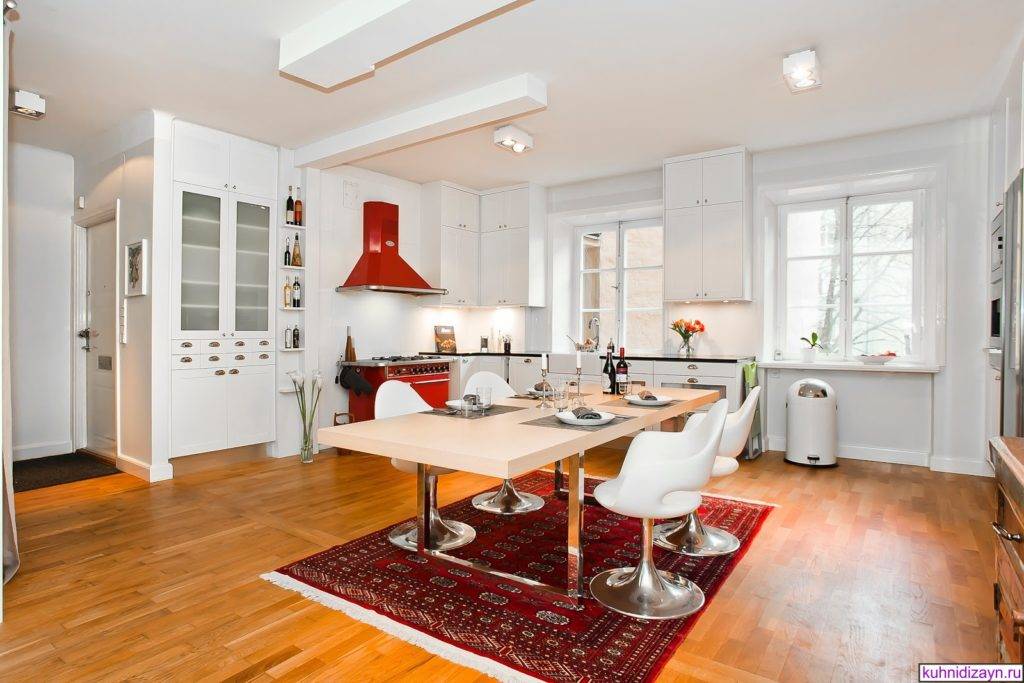 Выраженной чертой конечно же является преобладание белого цвета. В таком интерьере это фон, чистый лист бумаги на котором строится вся картина кухни-гостиной. Таким цветом может быть пол, стены, мебель и текстиль. Светлый фон принимает участие в скандинавском стиле не спроста. Во-первых речь идет о северных странах, во-вторых он компенсирует недостаток солнца.