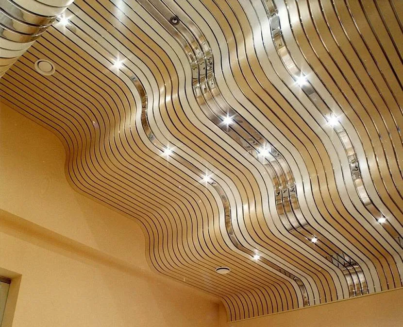 Один из кассетных вариантов, конструируется из модулей. Подходит для помещений любого назначения, способен визуально увеличить пространство и подчеркнуть дизайн. Сам материал имеет защитную пленку, которая предотвращает монтажные деформации. Размеры квадратов могут быть разными, это зависит от площади помещения. Часто такое оформление применяется модульно. Например, для оформления зоны освещения или любого декора.