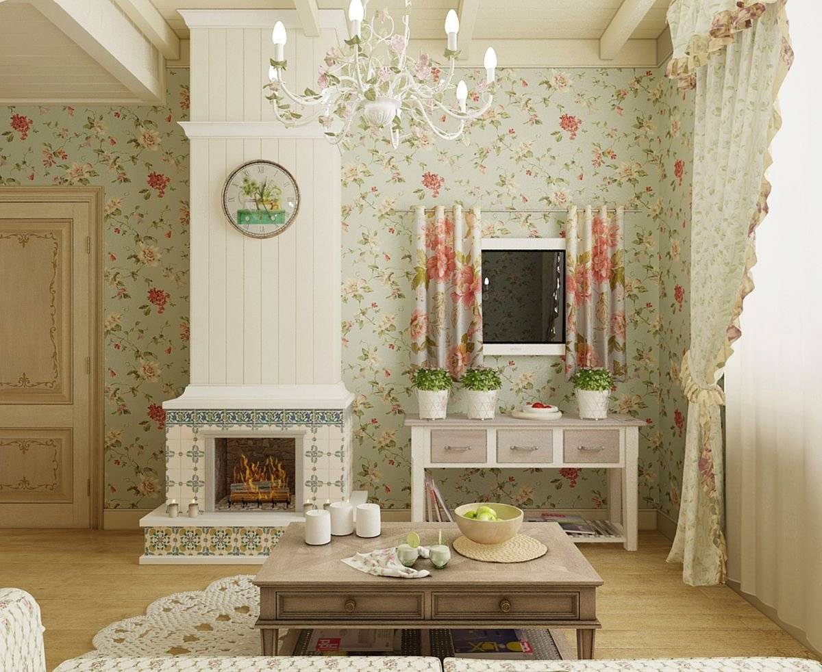 Стены в интерьере гостиной кантри, как правило, покрывают матовой краской, оклеивают обоями с гладкой фактурой, цветочным орнаментом, а также тканью с растительным принтом.