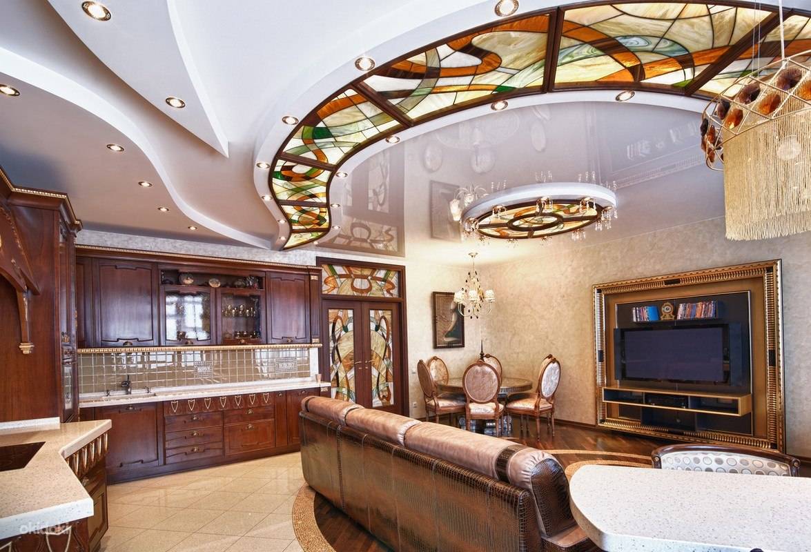 Если в модерне для стен отводится функция фона, то потолок в гостиной будет своеобразной изюминкой. Ей может стать красивая лепнина с цветочными элементами, красочные витражи, деревянные ажурные балки, зеркальные вставки, молдинги. Приемлемо создание двух уровней с различной отделкой. Потолок необязательно должен быть белый, для модерна характерна и нежная отделка розовыми, голубыми, кремовыми тонами. Стильную гостиную часто могут венчать целые картины, витиеватые узоры, орнаменты из природных элементов.