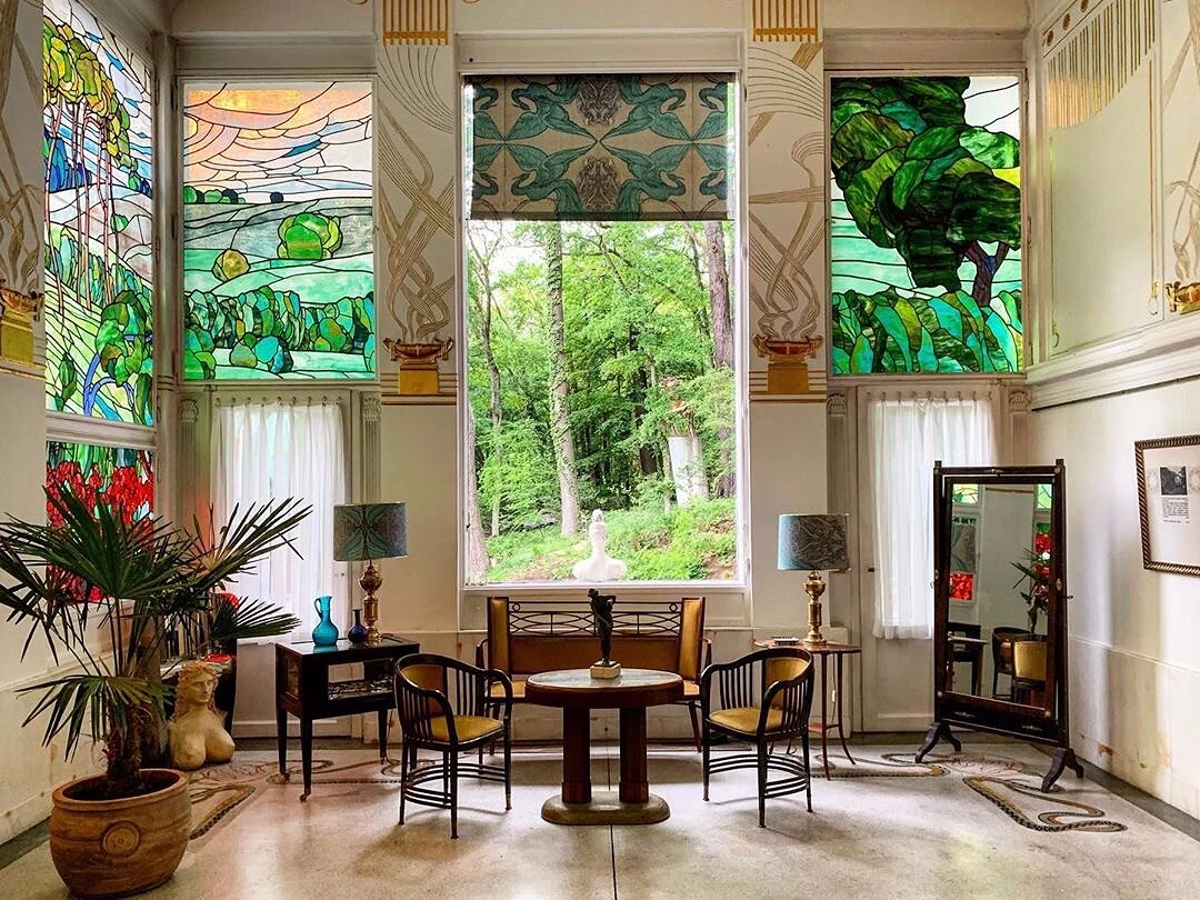 Исторические, многоквартирные дома в стиле модерн имеют большие высокие окна, которые являются образцом, когда дело доходит до их украшения. Они украшены богатыми шторами с цветочными мотивами, часто с декоративными кисточками с обеих сторон окна. Шторы тяжелые и богато украшены орнаментальными и цветочными мотивами. Дополнительными декоративными акцентами являются аксессуары, приколотые по бокам окна. Вся отделка окон подчеркивает и дополняет уникальность интерьера.