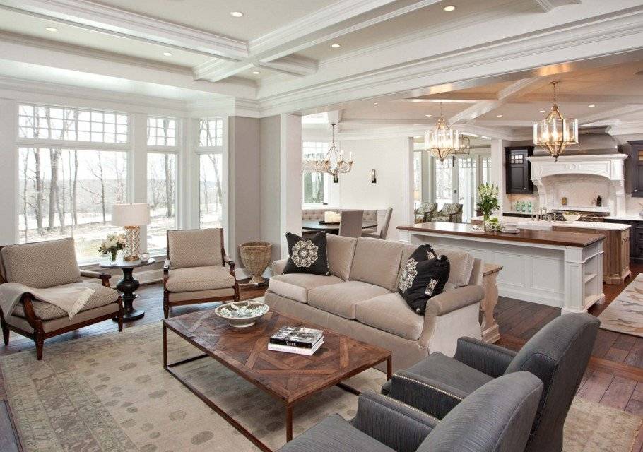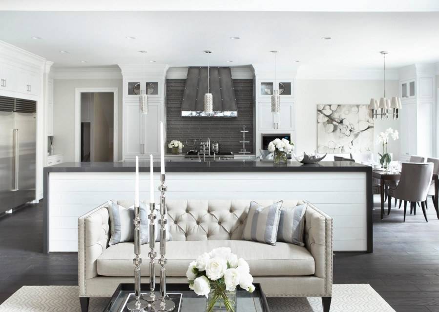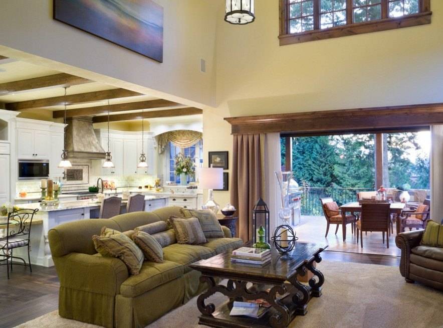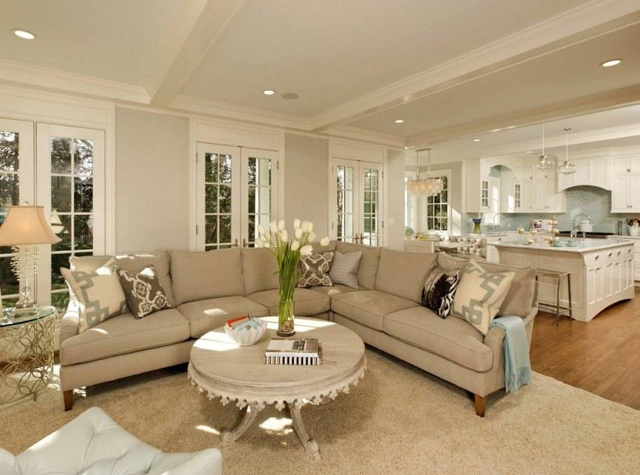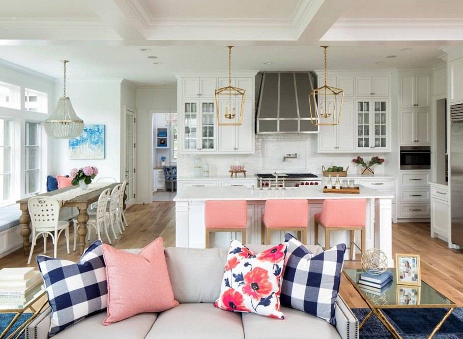 Цветовая гамма гостиной и кухни выдерживается в одинаковых светлых тонах, а вот потолок и пол, как правило, оформляются по-разному. Грубо оштукатуренный белый потолок кухни можно украсить деревянными балками, а в гостиной оставить его просто в виде ровной светлой поверхности.
