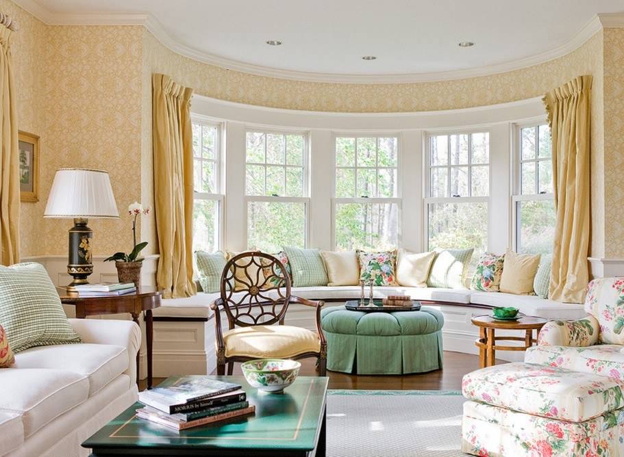 - В комнатах должно быть много окон. Их оформляют легкими занавесками с растительным узором. Гармонично смотрятся такие гардины в той же расцветке, что и обои. Конечно, если вы не можете спать с полупрозрачными шторами, в частных домах можно использовать и роллеты, и рулонные полотна, и римские модели. В собранном виде их практически не видно, поэтому они не участвуют в композиции и не портят ее.