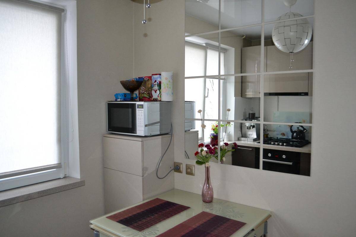 Такие поверхности хорошо отражают свет, а это помогает помещению восприниматься более просторным. На маленькой кухне можно сделать зеркальный фартук или повесить зеркало в обеденной зоне.