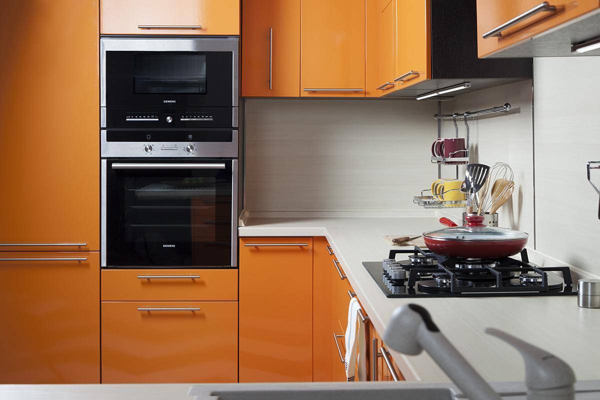 Техника, встроенная в гарнитур, делает конфигурацию кухни более эргономичной. При этом требуется внимательно относиться к габаритам: приборы (холодильник, микроволновка, кухонный комбайн и т.д.) должны помещаться в шкафах и обслуживаться без проблем.