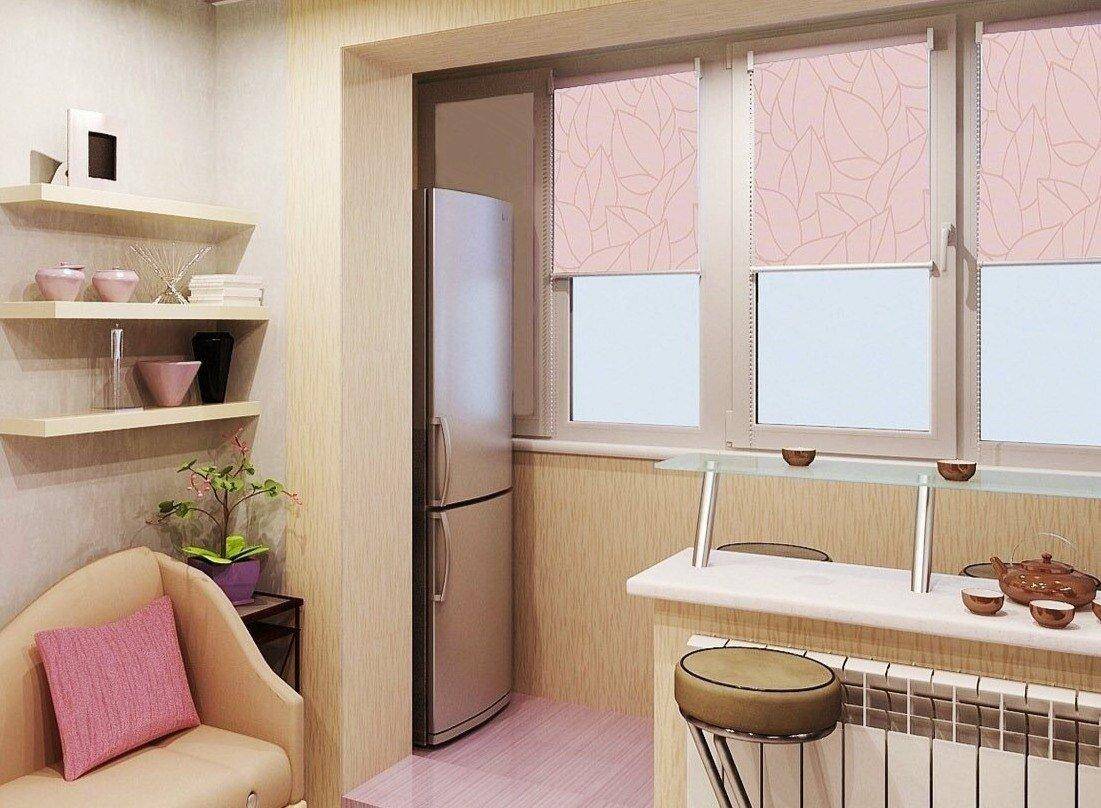 Кроме того, на объединенный с кухней балкон можно вынести холодильник. Таким образом, помещение сразу освободится и станет более просторным. Чтобы эта часть кухни выглядела более привлекательной, на месте бывшей стены можно обустроить арку, придав ей интересную форму.