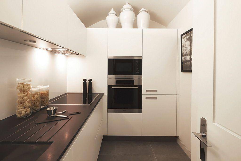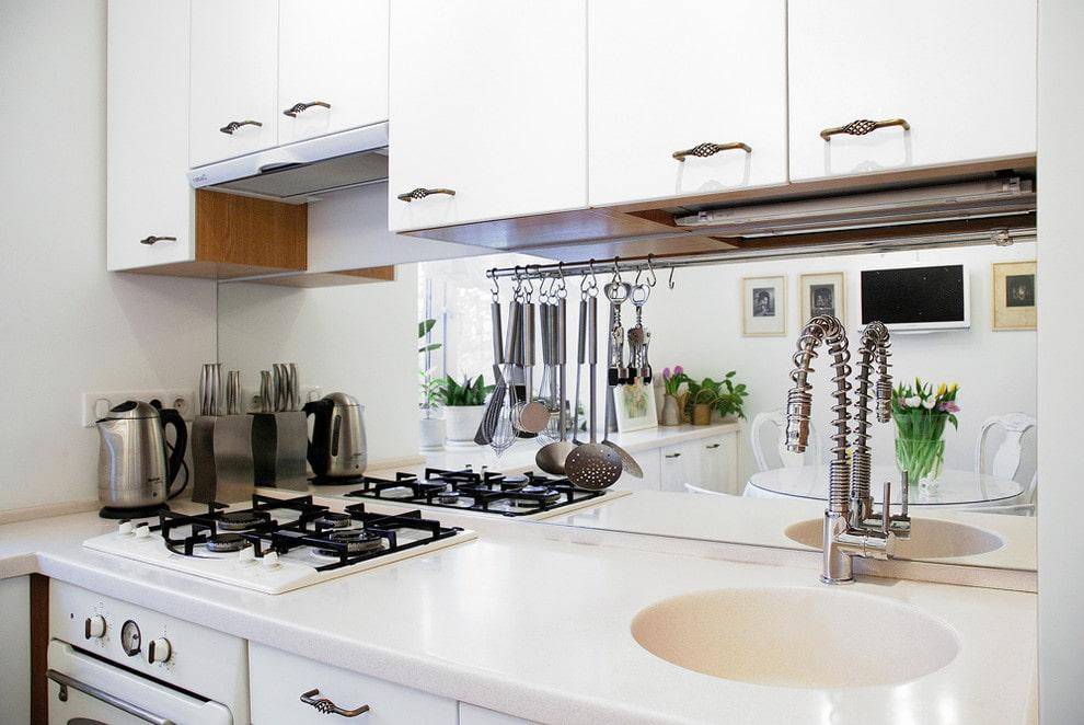 Дизайн тесной кухни следует продумывать так, чтобы нивелировать впечатление тесноты. Светлые цвета, минималистичный дизайн, зеркальные и глянцевые поверхности работают именно на эту цель.