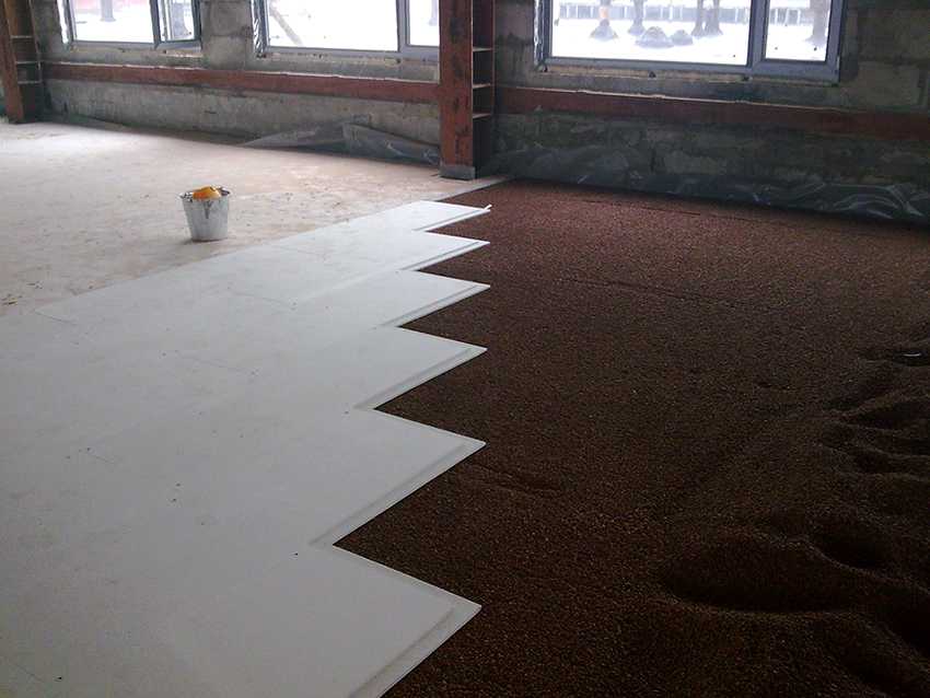 Применение гипсоволокна на пол возможно благодаря его повышенной прочности и восприятию к нагрузкам. Для начала необходимо выполнить подушку из керамзита, затем укладку ГВЛ. Для улучшения теплоизоляции производить монтаж ГВЛ в 2 слоя.