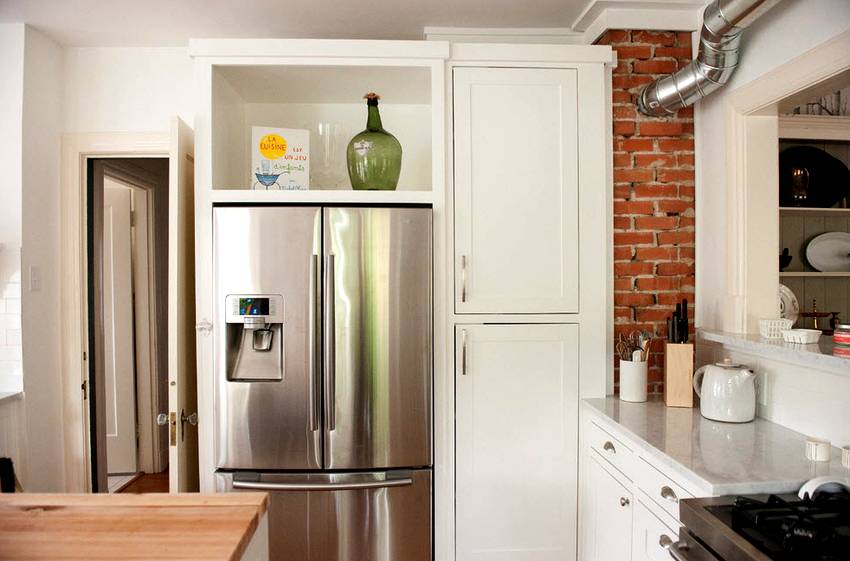 - Холодильники можно встроить в любую мебель. Главное – выбрать размер и предпочтительный дизайн. При небольшой площади кухни устройство можно перенести в спальню или на балкон, замаскировав под тумбочку, столешницу или шкаф.