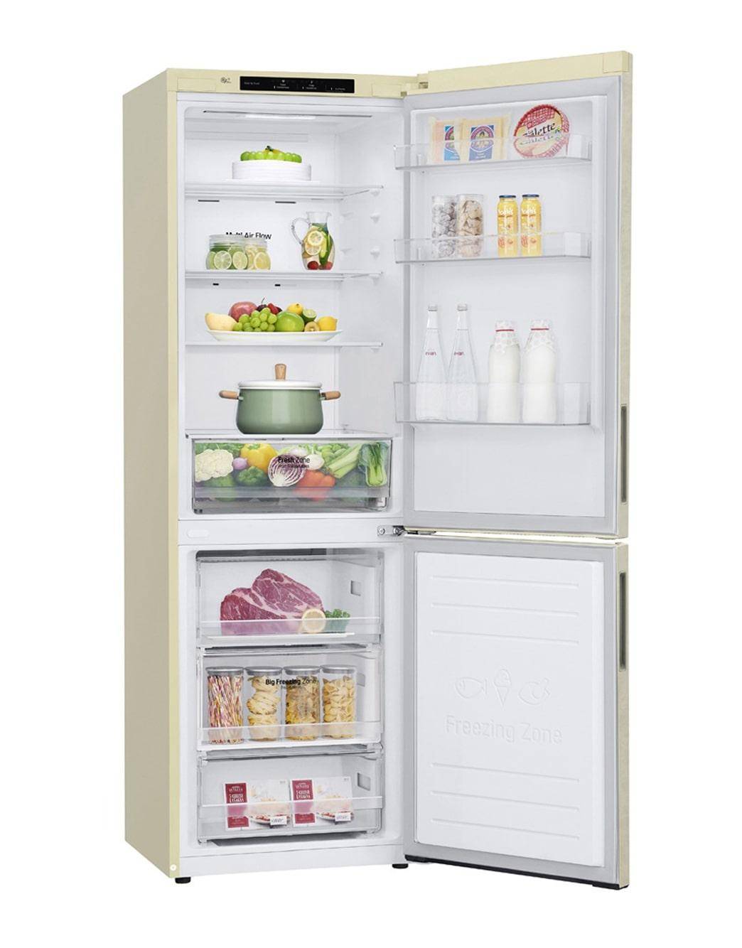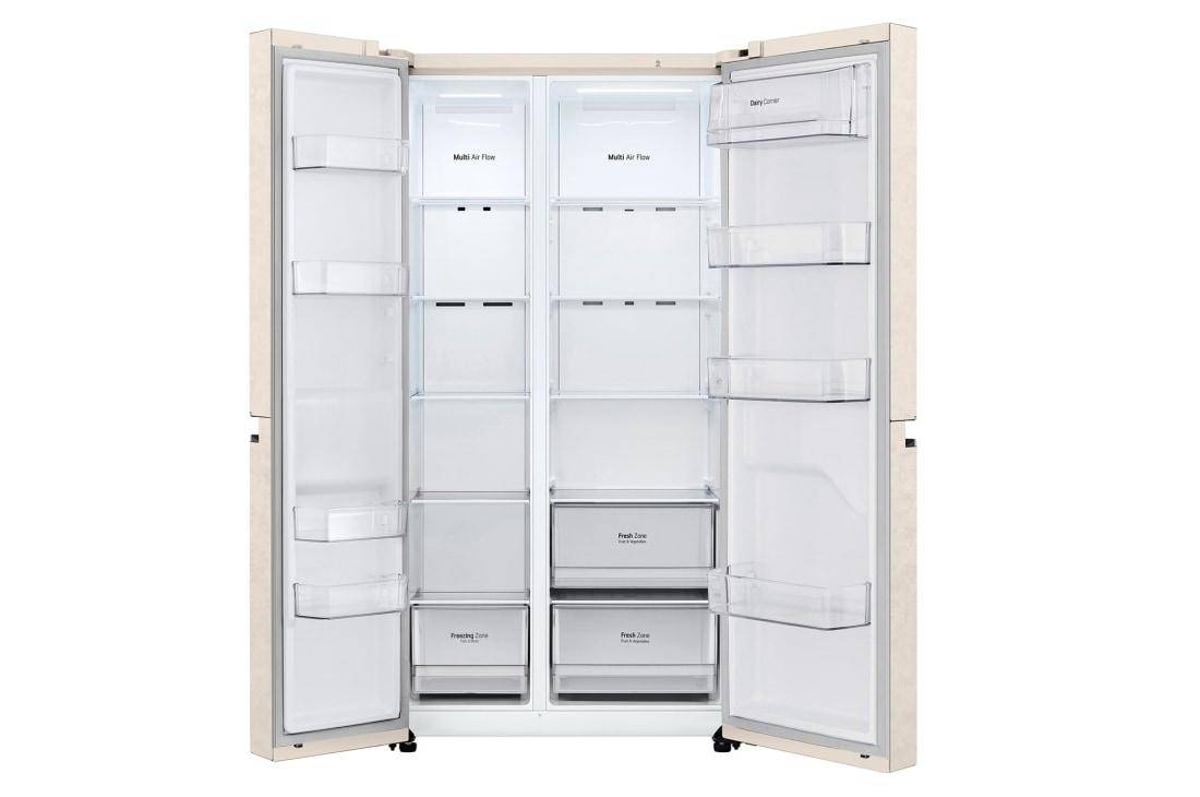 Бежевый холодильник LG, двухдверный механизм которого мягко и плотно закрывается, оберегает продукты от бактерий. Вместительные камеры рассчитаны на 643 л. Температура холодильной камеры гибко настраивается в пределах 1-7°C. Не более 36 Дб шума создаёт мощный линейно-инверторный компрессор, способный заморозить 12 кг/сут при -15°C. Камеры располагаются параллельно: слева – морозильная, справа – холодильная.