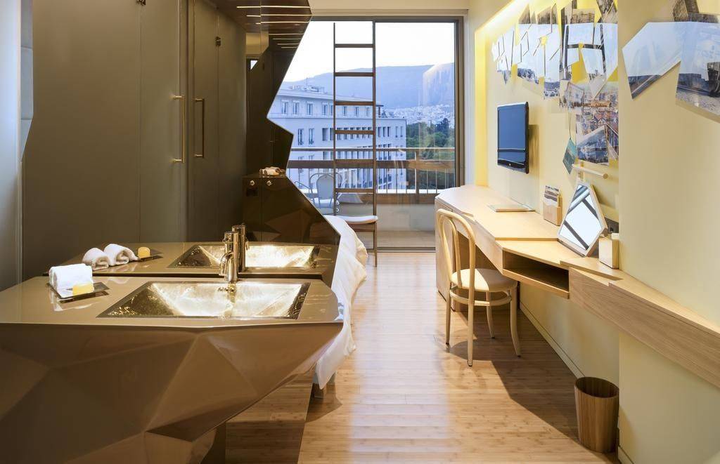 Роскоши в номер добавляют графичные латунные умывальники и панорамные окна от потолка до пола.