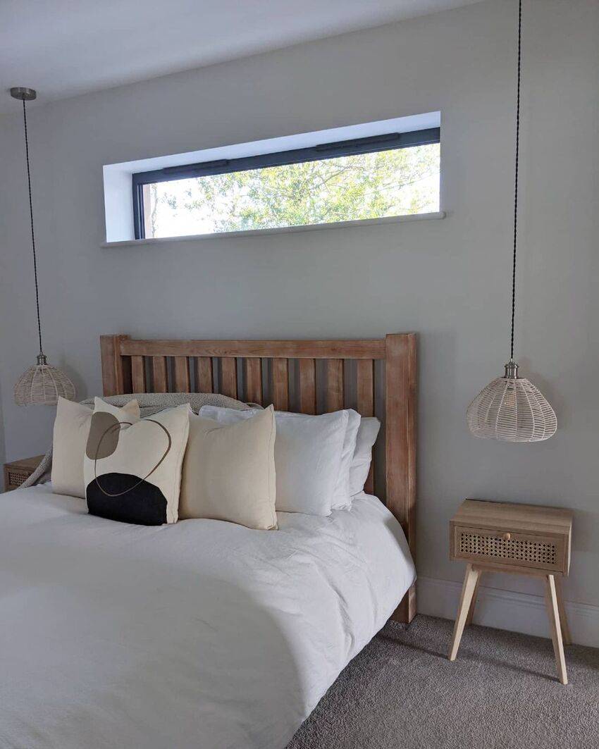 Оконный проем у изголовья кровати добавит в спальню естественное освещение