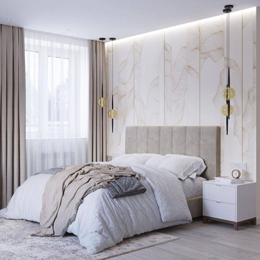 Изголовье кровати можно оформить с помощью яркого цвета, сделав его тем самым акцентом в маленькой спальне. Можно обойтись и без изголовья, выделив заднюю стену с помощью обоев с принтом или тканевых панелей. Здесь уже кому как нравится.