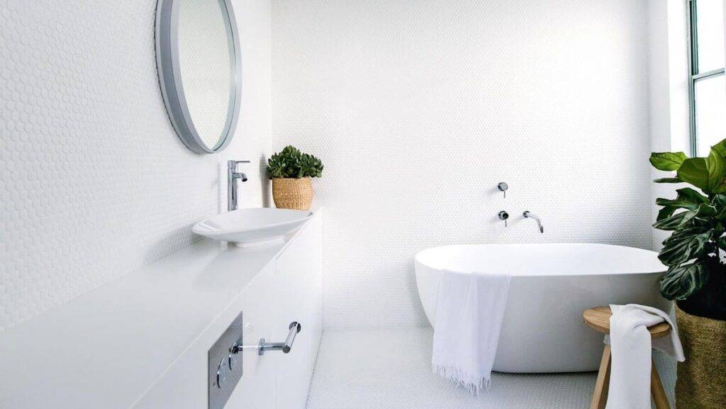 Это универсальный оттенок для отделки ванной, своего рода классика, которая никогда не выходит из моды. Белый цвет выглядит стильно, он наполняет комнату светом, визуально расширяет пространство.