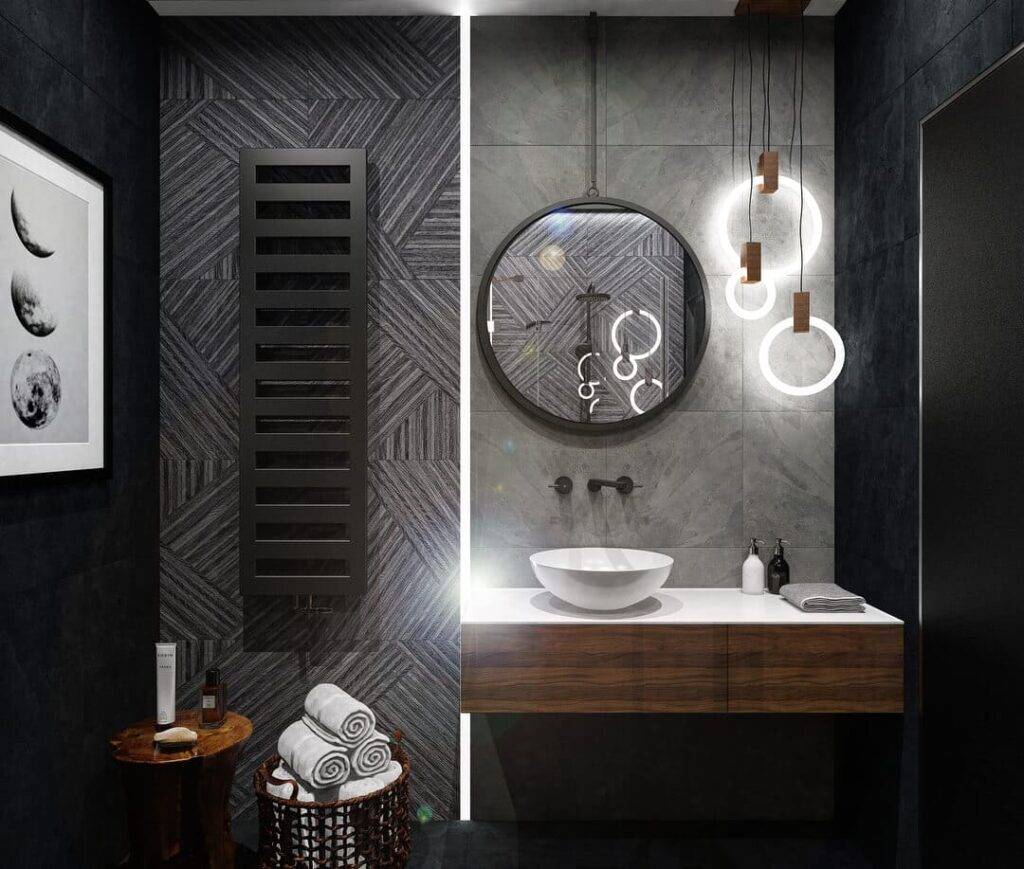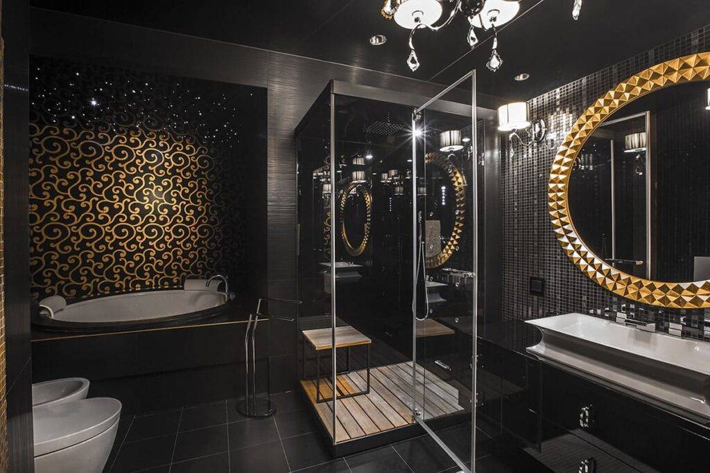 Комната в чёрных оттенках – большая редкость. Душевая и так занимает меньше пространства, чем жилые помещения, даже вместе с туалетом. Тёмный же цвет как будто визуально сужает комнату и давит психологически. Чтобы не пришлось переделывать ремонт через месяц, чёрный лучше сочетать с другими оттенками.