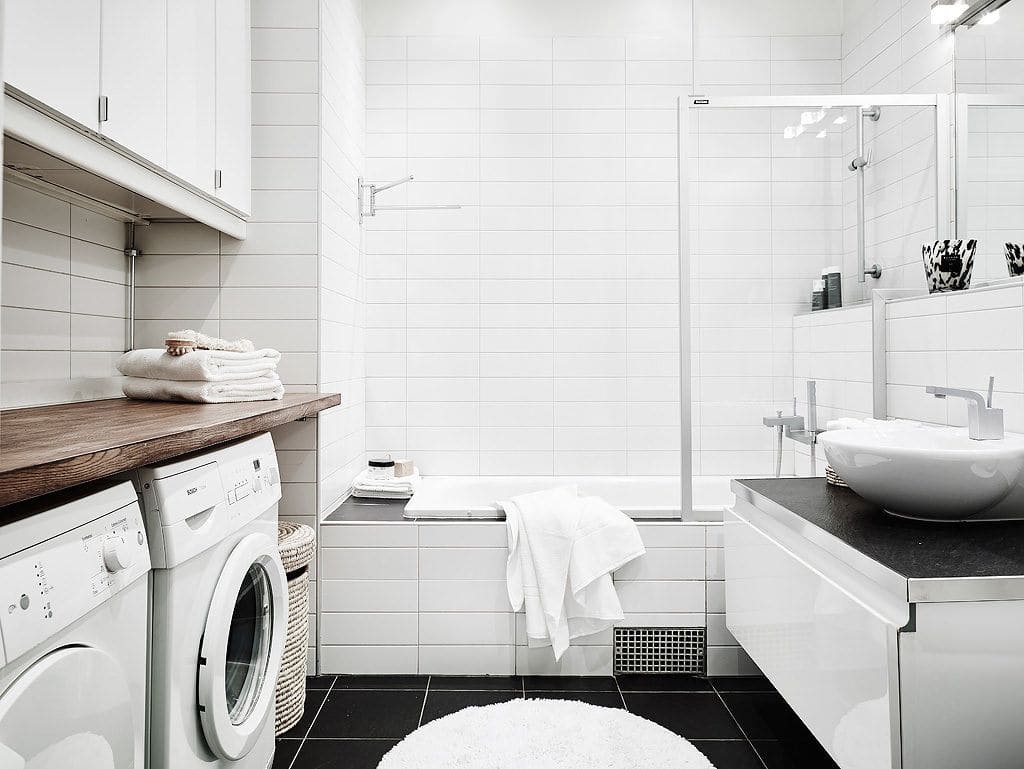 Визуально размер этой ванной уменьшается до границы белой плитки. Для зонирования достаточно отличий в цвете на пару тонов. Нет нужды использовать настолько контрастные отделочные материалы в маленькой ванной комнате.