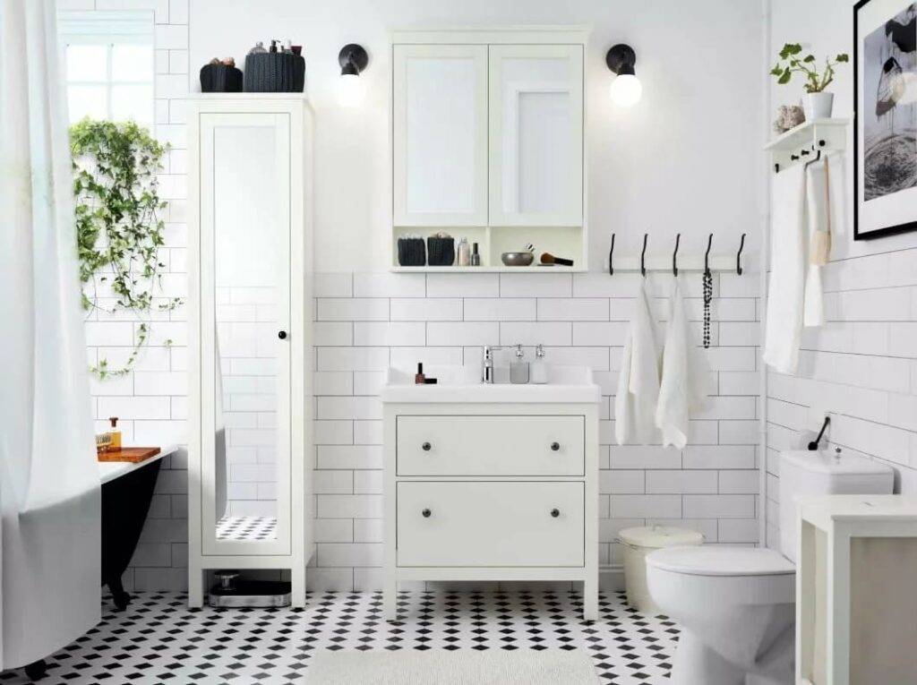 - Найдите место для узкого вертикального или углового шкафа. Обычно все фото в интернете делаются в стерильно чистой ванной комнате, какой по факту она не бывает. Дизайн без порядка не имеет смысла, а поддерживать порядок без закрытых систем хранения нереально.