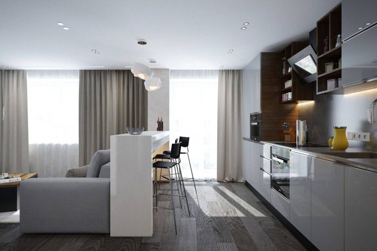 Если хозяин квартиры считает, что кухонное пространство всё-таки должно соответствовать устоявшимся требованиям и отрицает радикальное вмешательство в планировку, то зонирование кухни и гостиной реально выполнить, оставив между ними немного стены-перегородки.