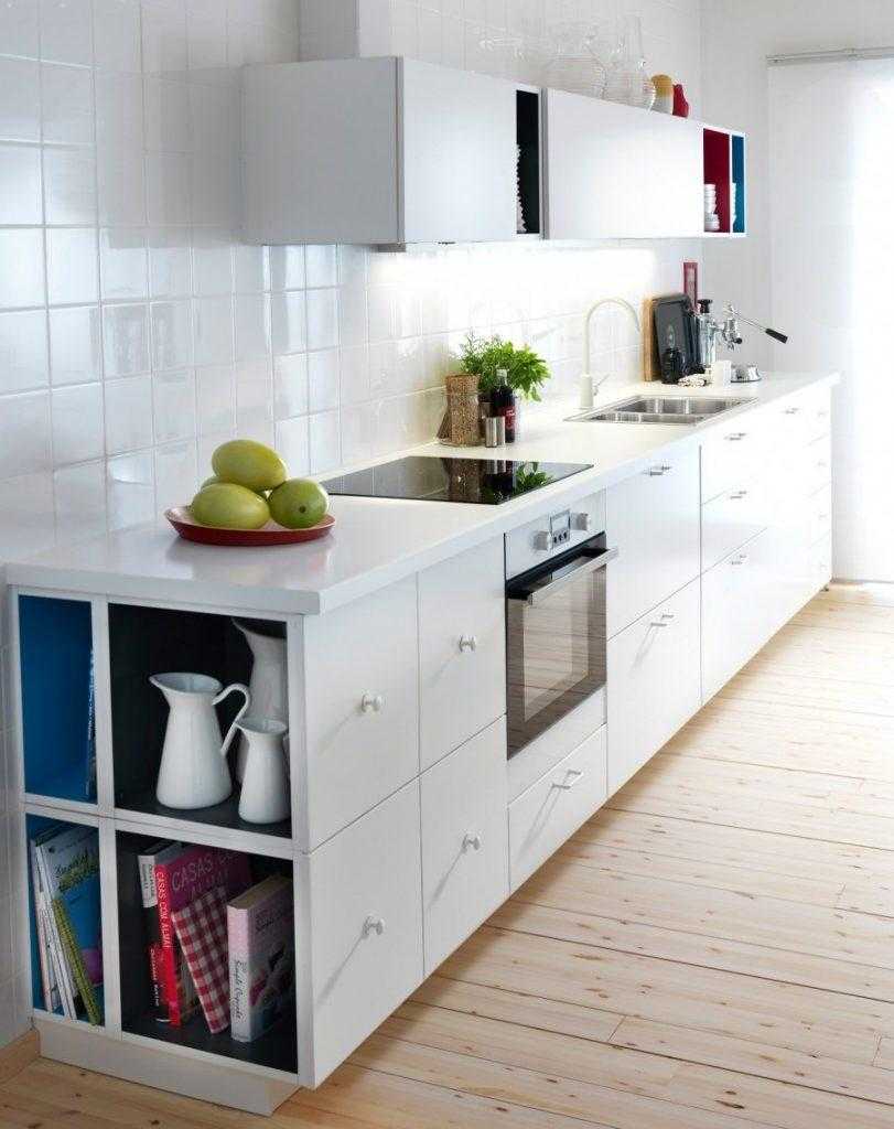 - Белая кухня IKEA – это привлекательное современное исполнение, в тренде мировых тенденций. Такой цвет будет делать помещение светлым, визуально расширяя границы за счёт отражения солнечных лучей. Интересный дизайнерский приём – дополнение белоснежной гаммы яркими акцентами.