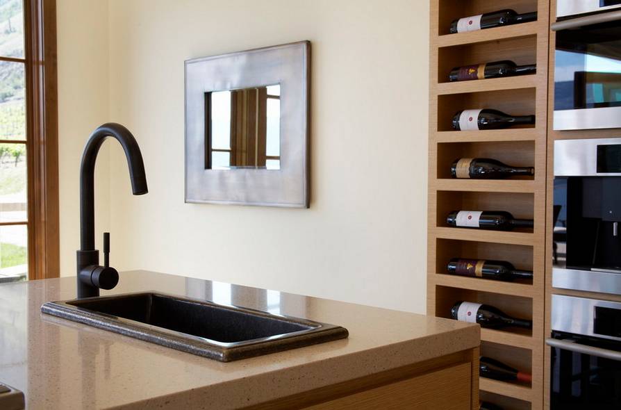 Кухонная зона часто служит местом для отдыха в кругу друзей. Спиртные напитки при этом можно хранить тут же. Только представьте себе уголок, напоминающий настоящий винный погреб, прямо у вас в кухне. Для этих целей лучше всего подходит открытый стеллаж из деревянного бруса.