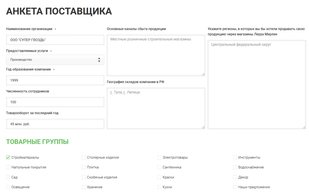 Кроме этого, среди обязательных требований: принятие Этического кодекса «Леруа Мерлен» (*), гарантия поставщика поставлять необходимое количество продукции, гарантия поставщика поддерживать стабильное качество товара, а также способность поставщика предложить упаковку, минимизирующую затраты на транспортировку.
