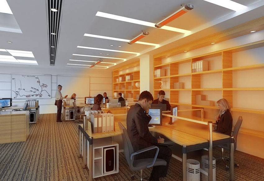 Эти помещения чаще всего обогреваются потолочными и подвесными приборами, устанавливаемыми в шахматном порядке. Выбираются бесшумные обогреватели с терморегуляторами.