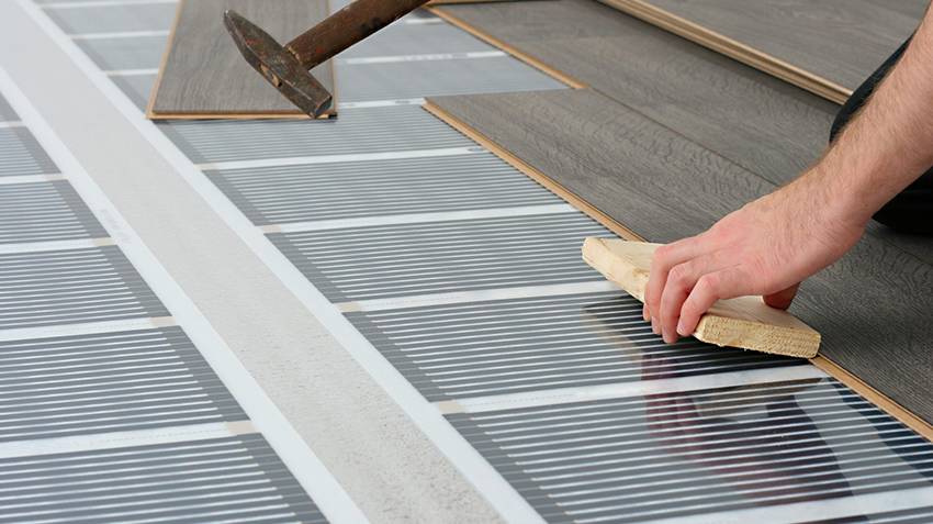 - Стелиться такая пленка на ровное подготовленное основание, застеленное специальным теплоотражающим утеплителем, он должен обладать высокой термоизоляцией, прочностью, герметичностью и огнестойкостью (лучше брать подложку той же фирмы, что и саму пленку). Сверху ложится напольное покрытие (при использовании линолеума, ковролина или других мягких настилов, под него необходимо застелить ДВП).
