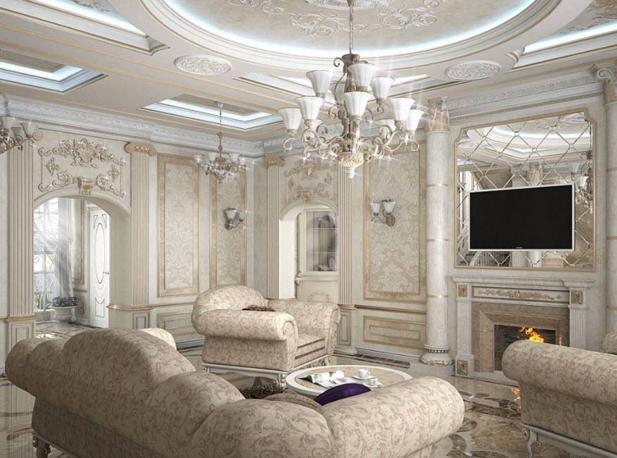 Лепнина на потолке гостиной, выполненной в классическом стиле