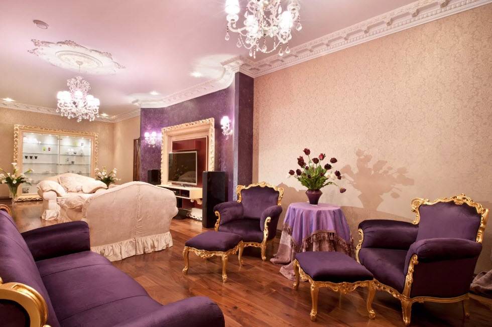 Сиреневый цвет – утонченное решение, позволяющее создать необычную гостиную с привлекательным дизайном. В оптимально случае сиреневый и его пастельные оттенки нужно сочетать с позолотой и бежевыми тонами.