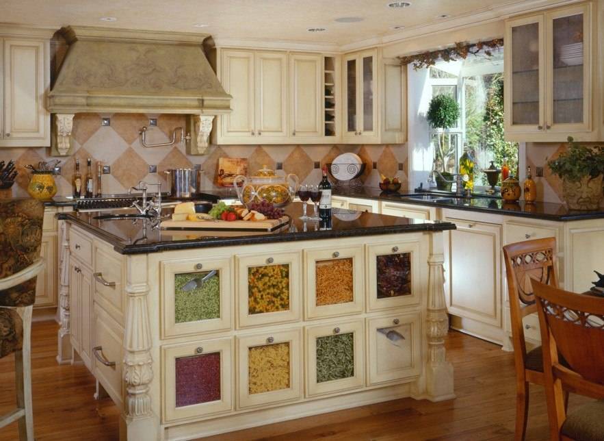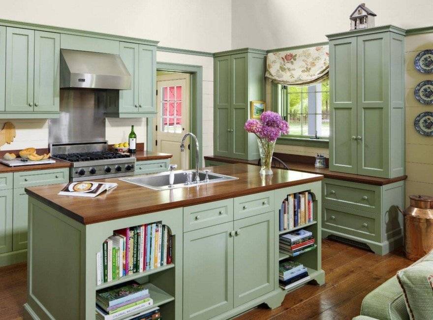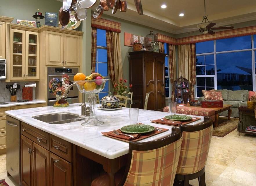 - Кантри стиль идеально передаёт деревенскую атмосферу. Он основан на следующих принципах: тёплые природные краски, массивная мебель из дерева, натуральные отделочные материалы, много открытых полок, которые заменяют навесные шкафы. Шторы, скатерть в клетку, изображения фруктов, животных и птиц, корзинки для хлеба и овощей, глиняная посуда прекрасно отражают сельский быт.