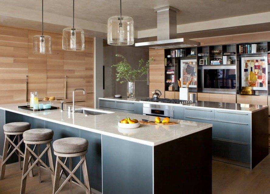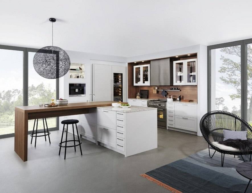 Если площадь небольшая, подойдет линейный или угловой мебельный гарнитур, с барной стойкой или откидным столиком. Если же места предостаточно, красиво будет смотреться в центре кухни островная конструкция.