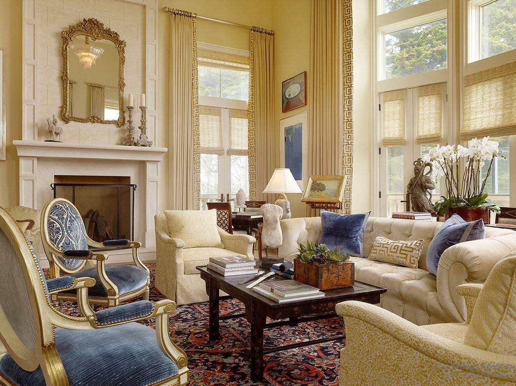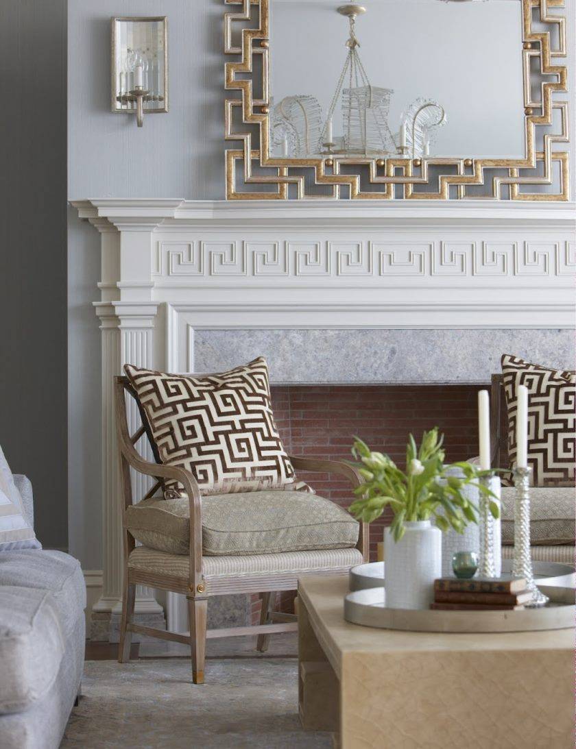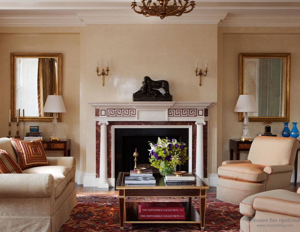 Красивая гостиная с камином в греческом стиле