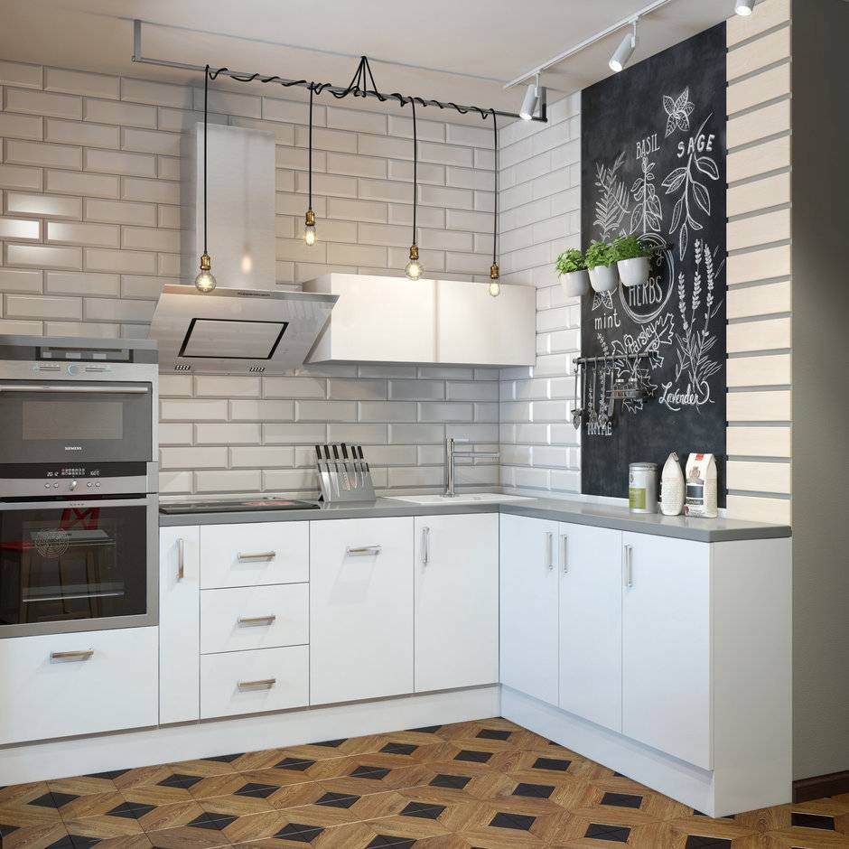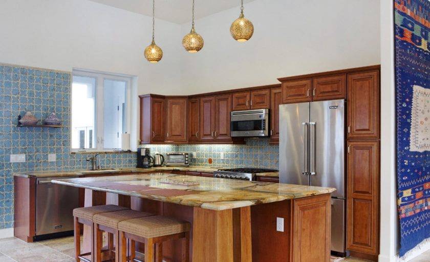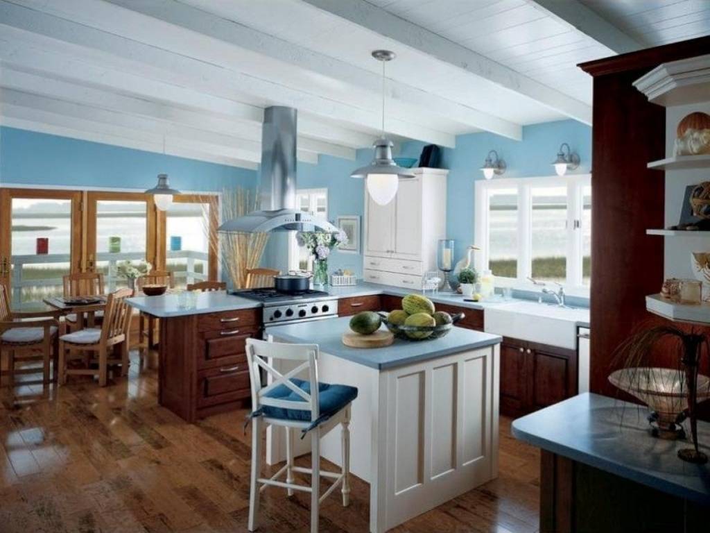 Отдайте преимущество мягким оттенкам. А вот зону для обеда можно выделить — синий, терракотовый, бирюзовый. Материал для нее применяйте тот же, что и для остальной кухни или поищите комбинированный вариант — иногда эти решения выглядят очень выигрышно.