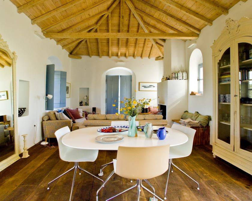Альтернативный вариант — простой с одним оттенком потолок, оформленный балками из дерева. Последнее не нужно делать фигурными — чем легче, тем лучше. Тем не менее, эта фраза и в общем передает дух греческого стиля.